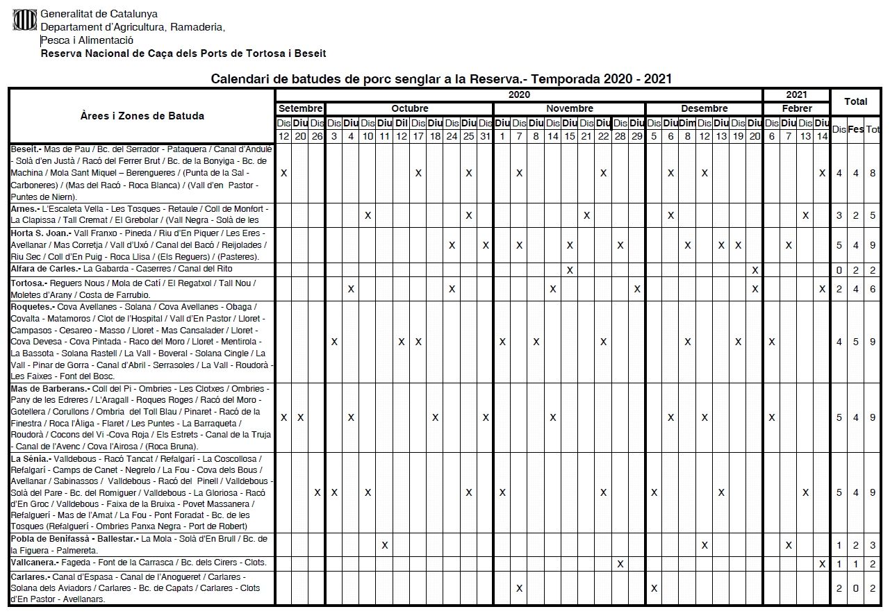 La Reserva Nacional de Caça dels Ports de Tortosa i Beseit ha publicar el calendari de batudes de porc senglar per a la temporada 2020-2021. Aquestes batudes estan organitzades per zones de Beseit, Arnes, Horta de Sant Joan, Alfara de Carles, Tortosa, Roquetes, Mas de Barberans, La Sénia, La Pobla de Benifassà - Ballestar, Vallcanera i Carlares.