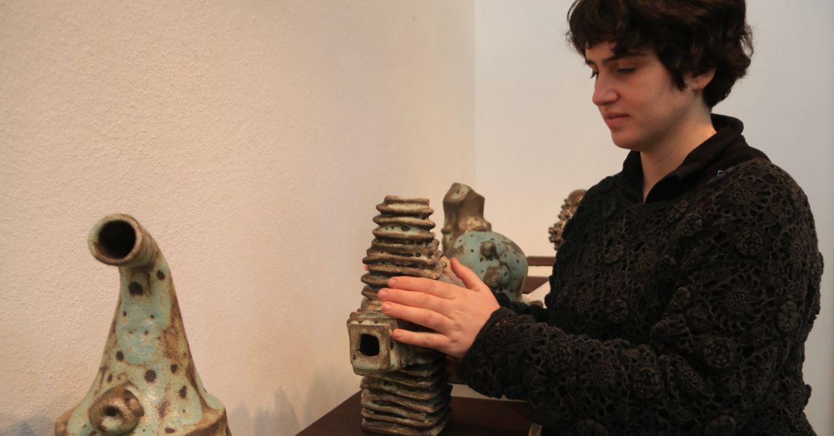 La ceramista Natàlia Gual acariciant una de les seves obres