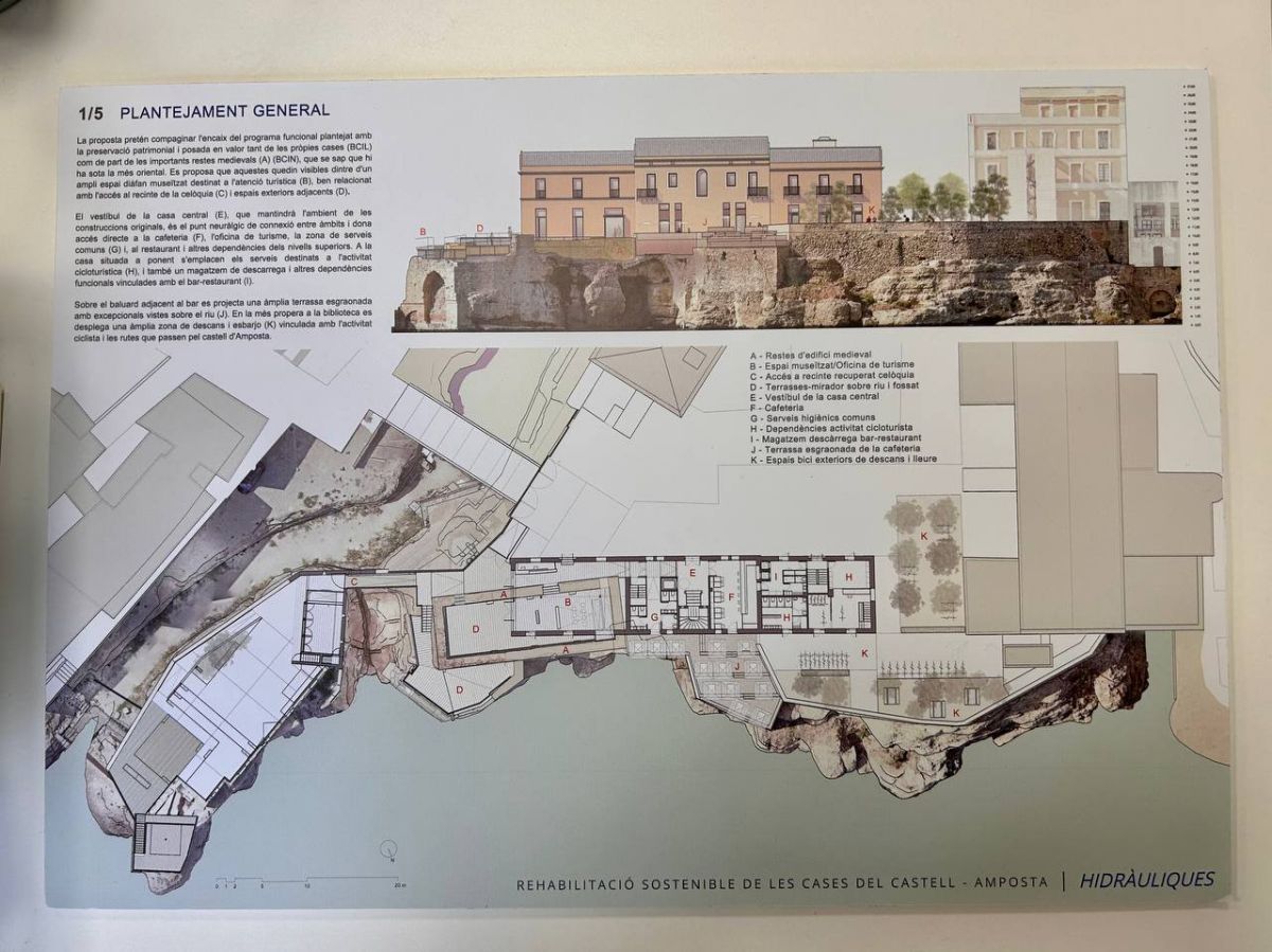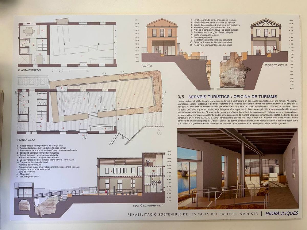 Un espai d’atenció al visitant museïtzat i amb les restes medievals del Castell visibles, un bar restaurant amb vistes sobre el riu i un espai de bicicletes. Són els principals elements que contempla la proposta guanyadora del concurs d’idees per a la rehabilitació sostenible de les Cases del Castell, obra del despatx Brull i Alfonso Arquitectura i Patrimoni. Seran ells qui redactaran ara el projecte de rehabilitació i faran la direcció d’obra per un pressupost de poc més de 46.000 euros. Dimecres al matí, l’alcalde d’Amposta, Adam Tomàs, acompanyat per la regidora de Cultura i Memòria Històrica, Inés Martí, del regidor de Turisme, Pep Simó i dels arquitectes responsables del projecte, han presentat la proposta que actuarà sobre les tres cases de la plaça del Castell, conegudes també com les cases del Molí de Cercós, catalogades com a Bé Cultural d’Interès Local (BCIL).