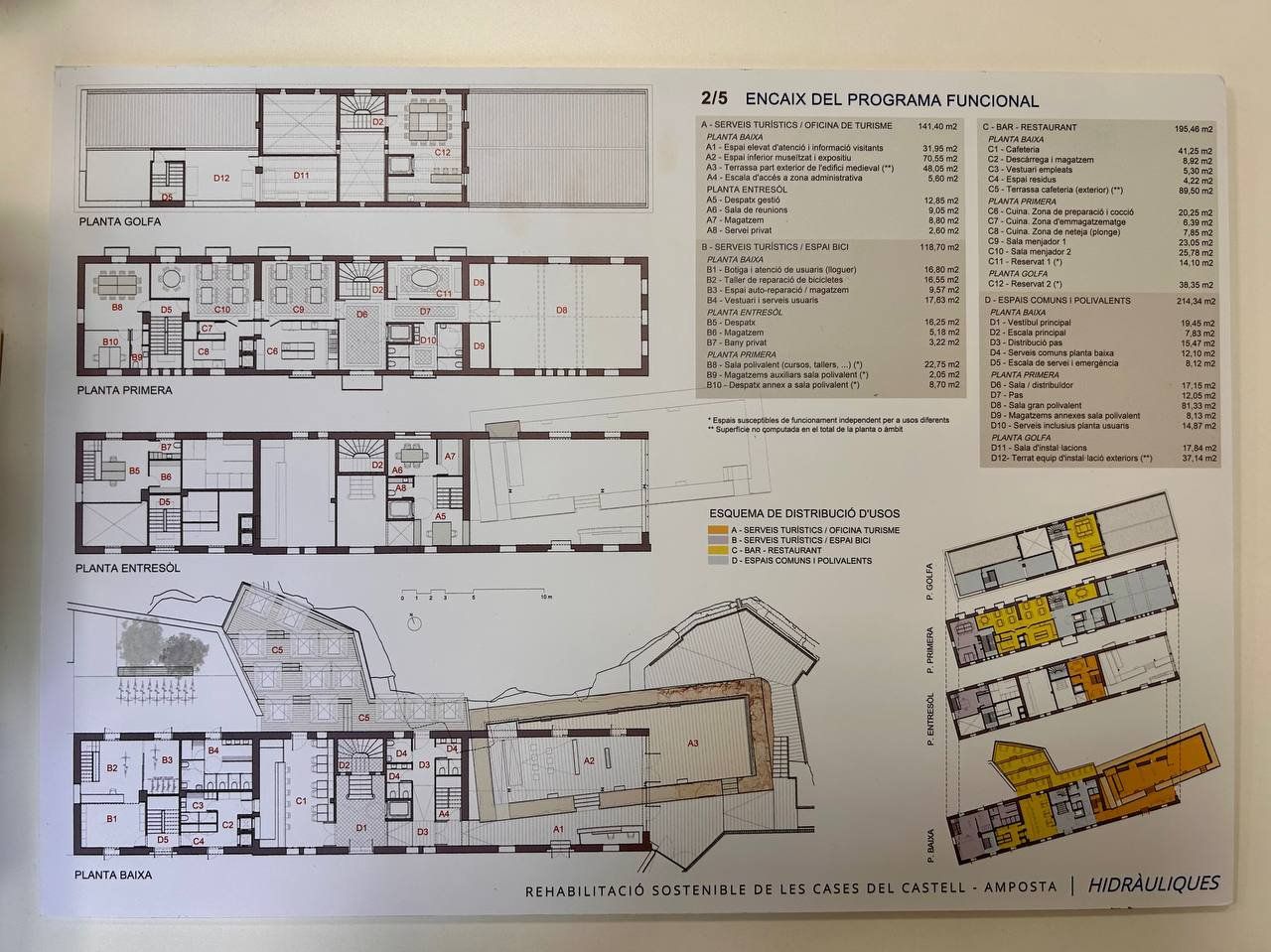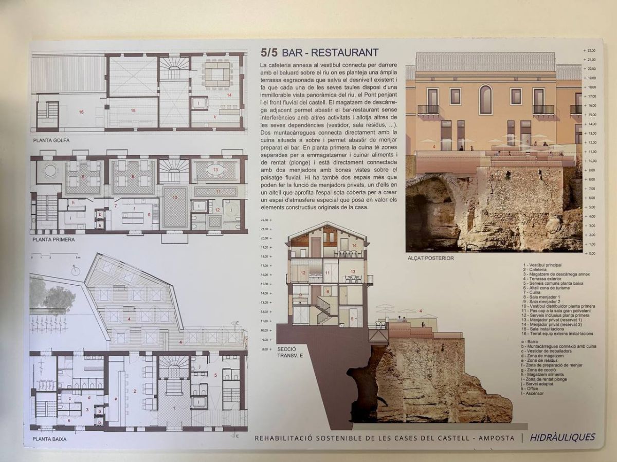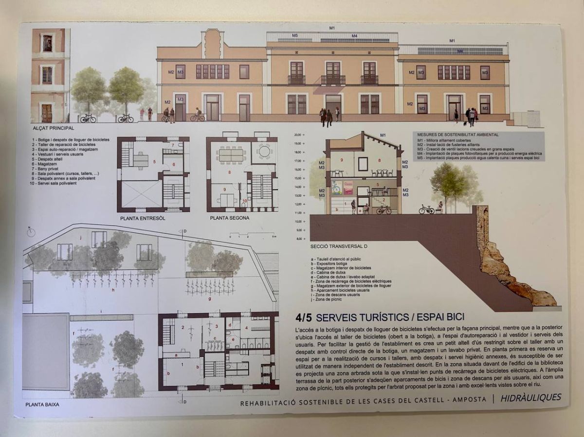 La proposta guanyadora, tal i com explicava un dels seus autors, Carles Brull, pretén compaginar la preservació i posada en valor de les tres cases amb les restes medievals que se sap que hi ha a sota de la més oriental. Així, es proposta que en aquesta casa, on s’ubicarà l’oficina de turisme, quedaran visibles les restes en un espai diàfan museïtzat i amb accés a la celòquia i els espais exteriors adjacents. Quant a la casa central, el seu vestíbul, que mantindrà l’ambient de les construccions originals, serà el punt de connexió entre àmbits, i donant accés directe a la cafeteria i als serveis destinats l’activitat cicloturística, situats a la casa més propera a la Biblioteca. És en aquesta casa on hi haurà la cafeteria i restaurant, amb una terrassa sobre el riu. La rehabilitació preveu, a més, criteris de restauració de tots aquells elements que sigui possible mantenir.