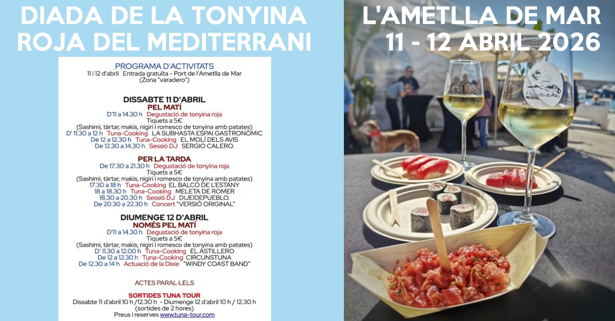 - 17:30 a 21:30 h. Degustación de atún rojo. Tiquets a 5 € (sashimi, tàrtar, makis, nigiri y romesco de atún con patatas).