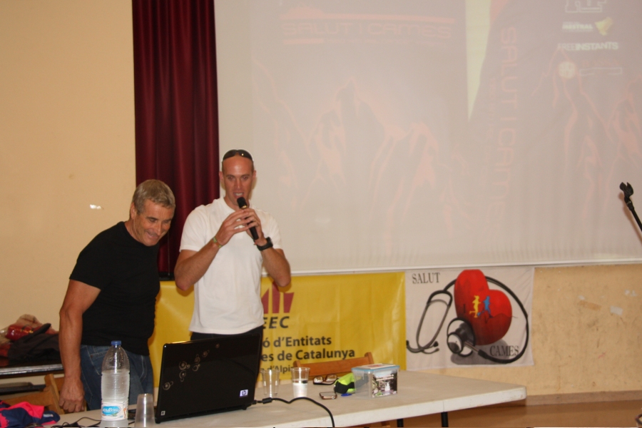 Josep Gavira, president del Club Serres del Mestral explica les etapes de la cursa. Al seu costat, Òscar Griñó