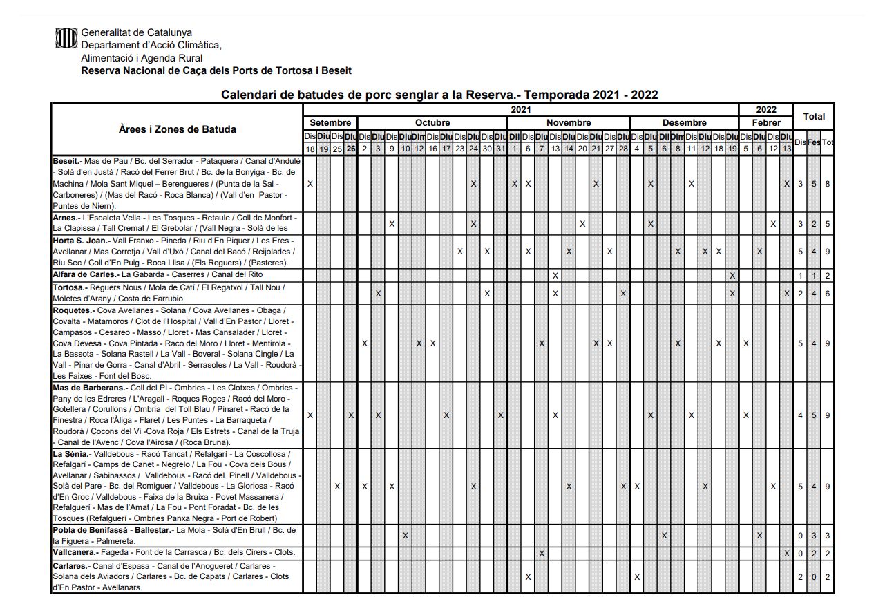La Reserva Nacional de Caça dels Ports de Tortosa i Beseit ha publicar el calendari de batudes de porc senglar per a la temporada 2020-2021. Aquestes batudes estan organitzades per zones de Beseit, Arnes, Horta de Sant Joan, Alfara de Carles, Tortosa, Roquetes, Mas de Barberans, La Sénia, La Pobla de Benifassà - Ballestar, Vallcanera i Carlares.
