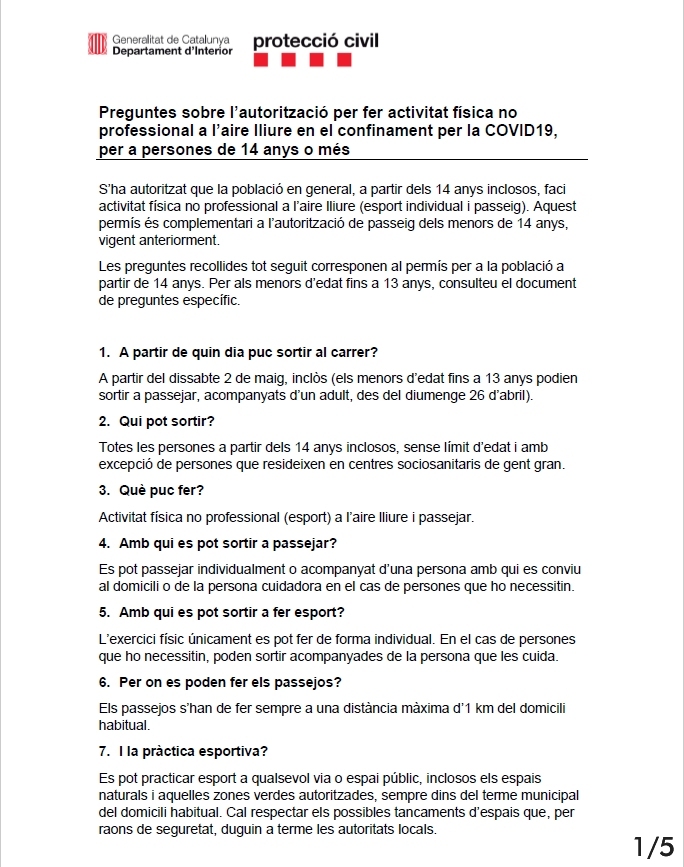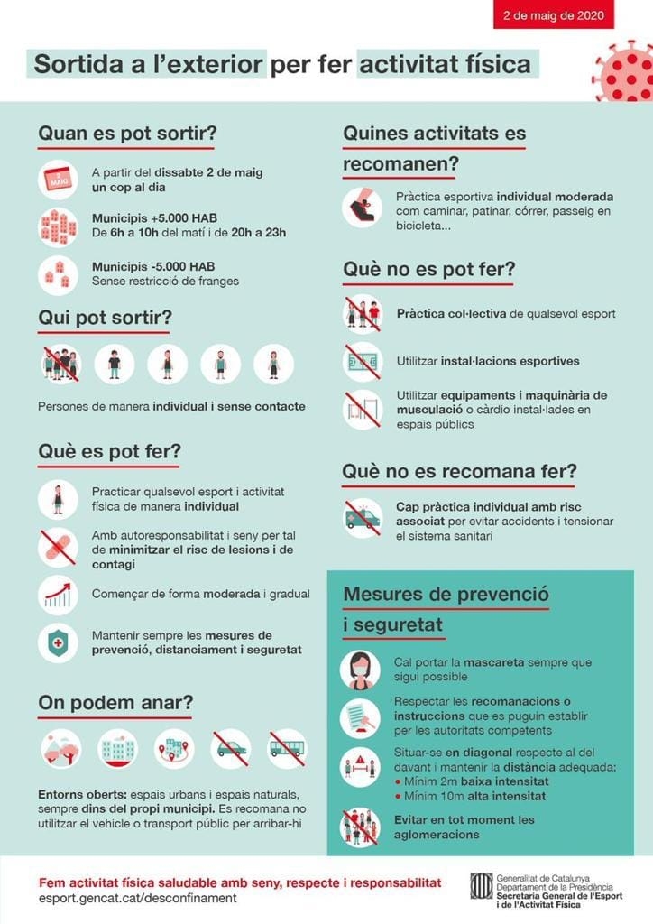 Passats aquests 47 dies de confinament, ja en la fase 0 de la desescalada, finalment a partir de demà 2 de maig ja estarà permès fer exercici a l’aire lliure, tot i que amb algunes restriccions.