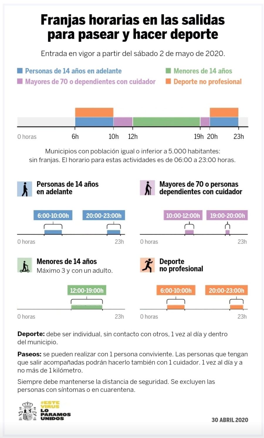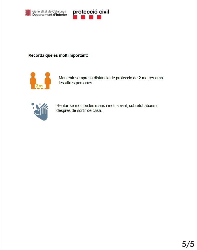 D’altra banda les persones depenents i els majors de 70 anys també podran sortir de casa, entre les 10 i les 12 del matí i les 7 i les 8 del vespre, per a passejar també a un màxim d’1 Km de la seva llar. Si és necessari podran anar acompanyades per una persona.