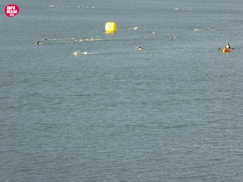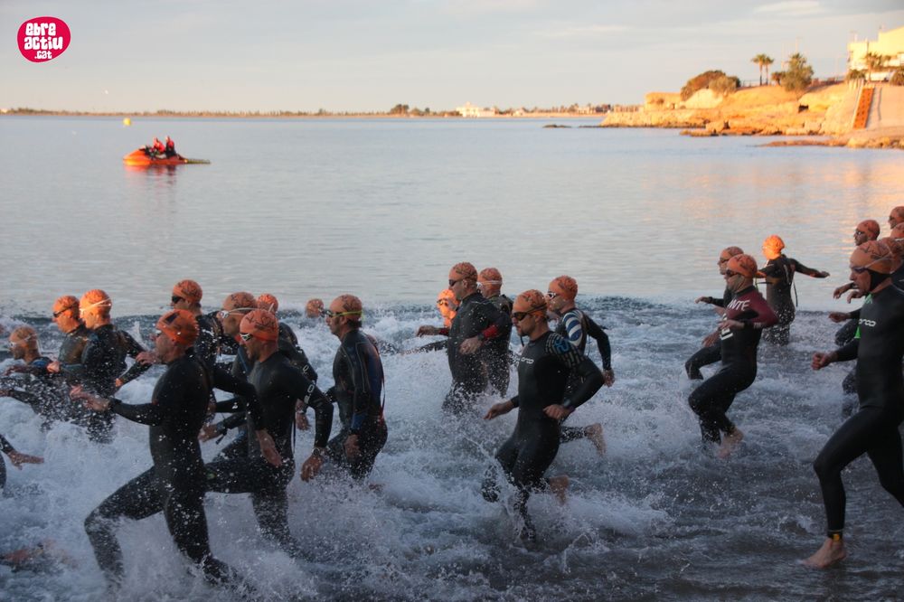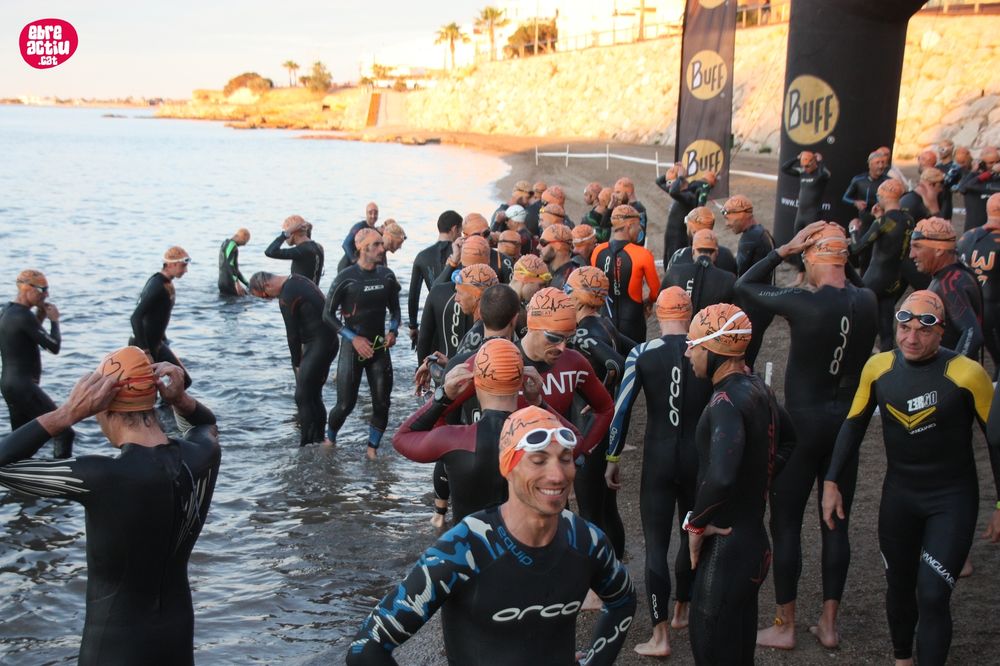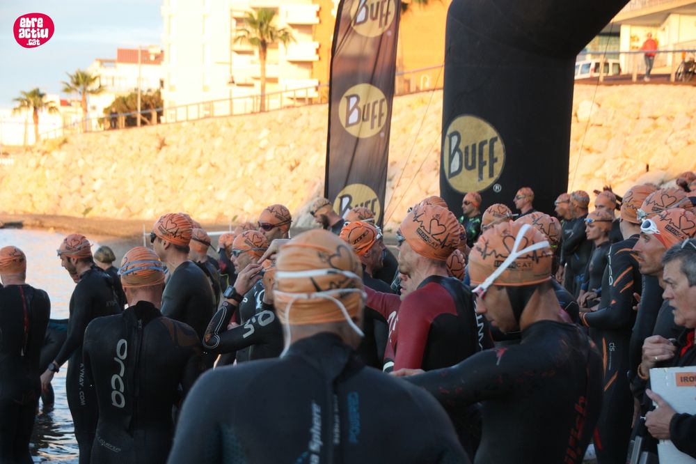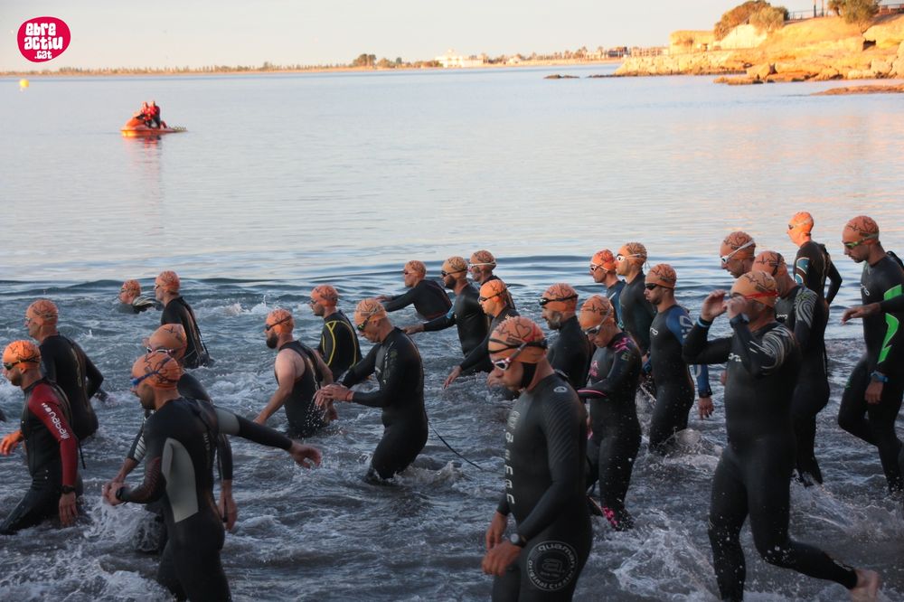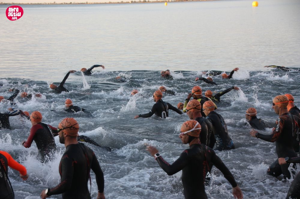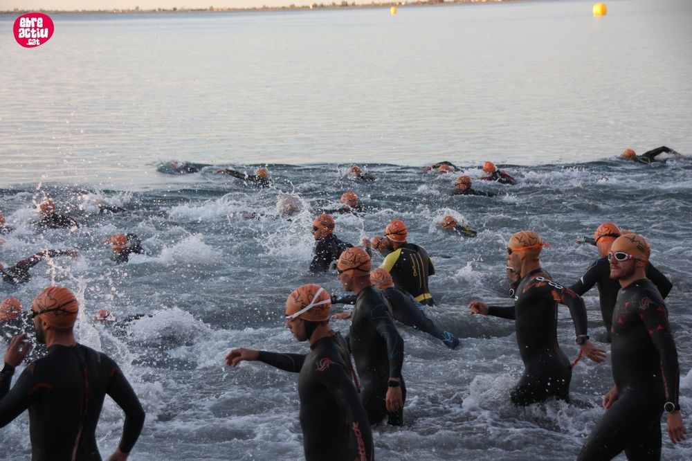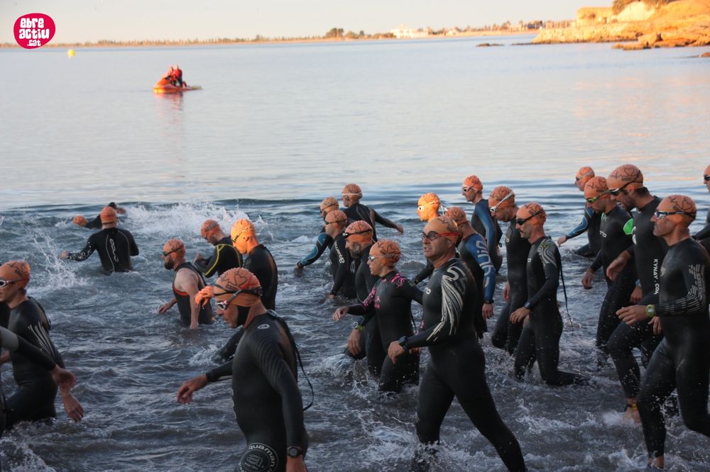 Triatló de llarga distŕncia, disputat a l’Ampolla (Terres de l’Ebre) el 18/5/2019. Fotos del sector de natació i primera transició.