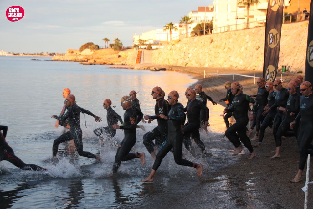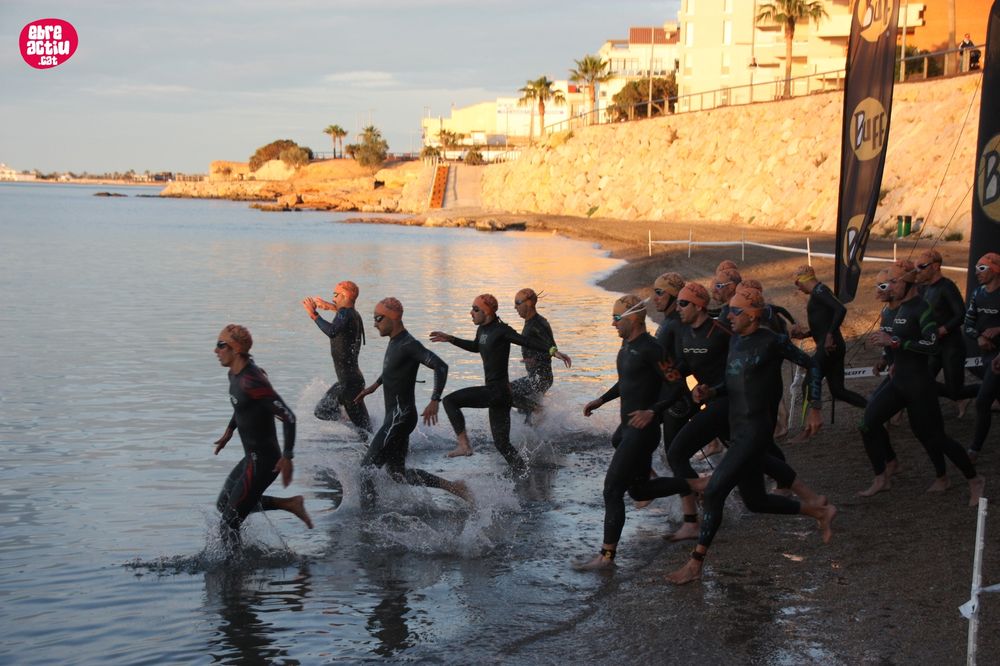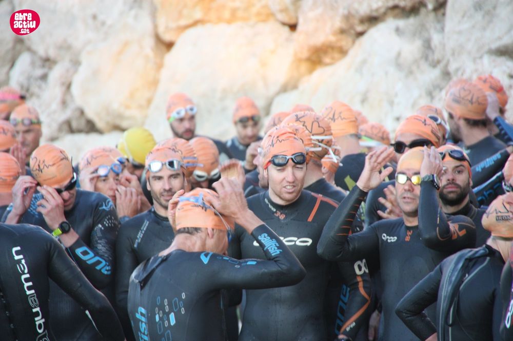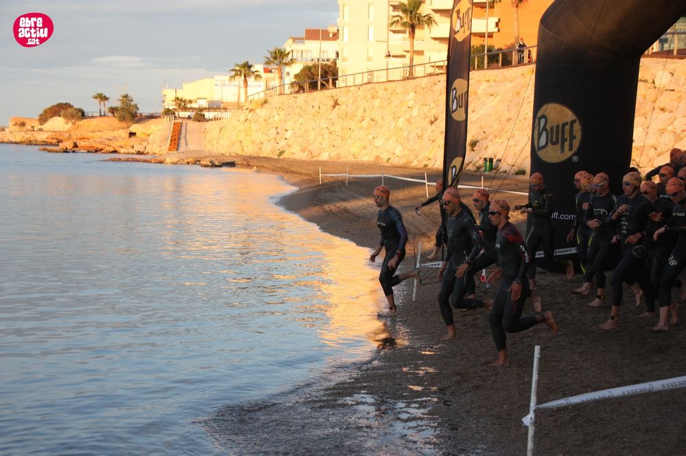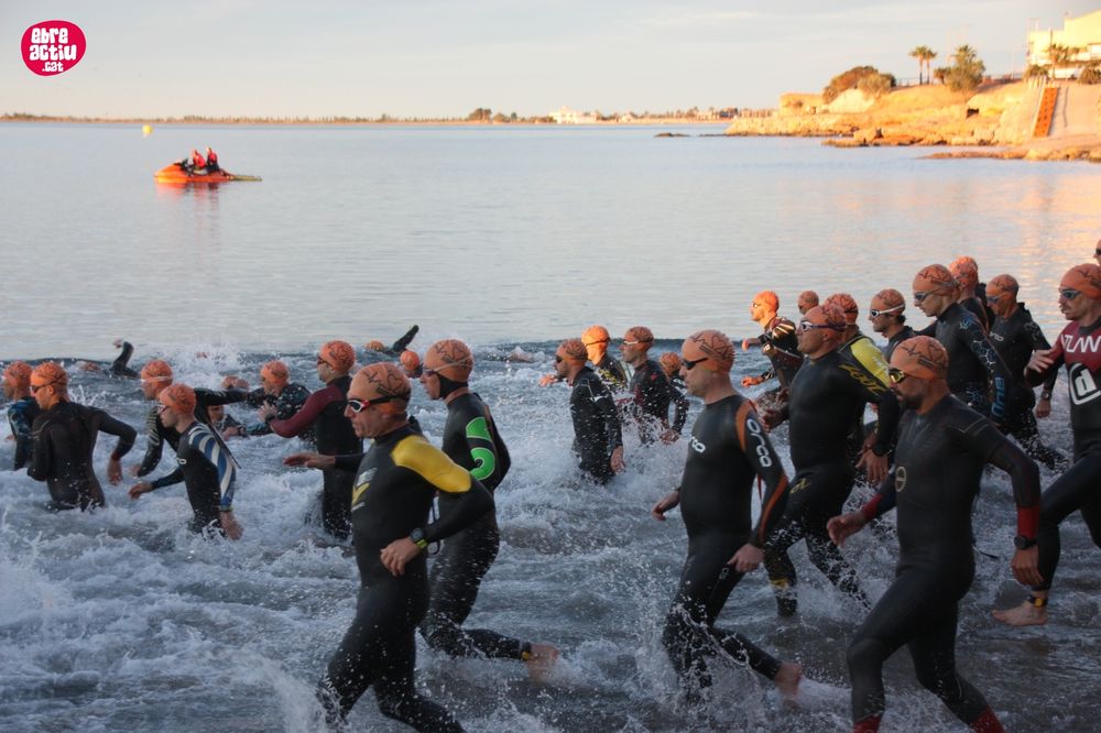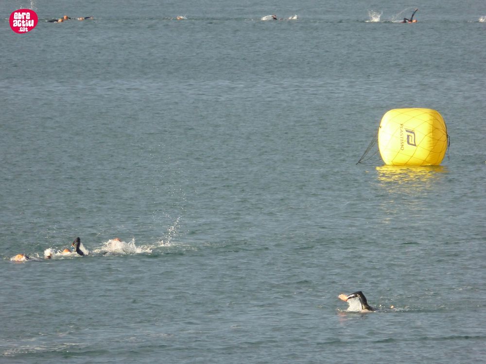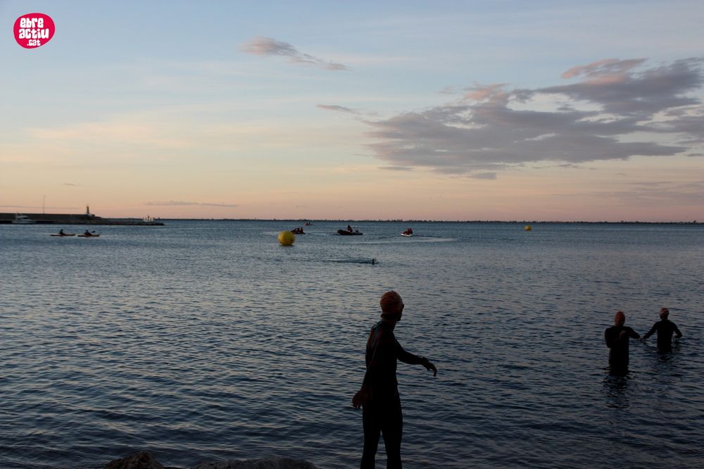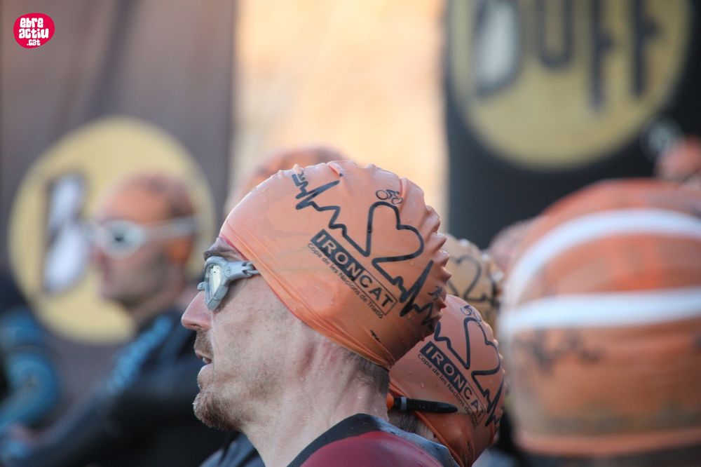 Triatló de llarga distŕncia, disputat a l’Ampolla (Terres de l’Ebre) el 18/5/2019. Fotos del sector de natació i primera transició.